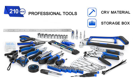 Prostormer 210 Piece mechanic tool set contains a carefully selected assortment of professional hand tools needed for most industrial, mechanical, and consumer applications. With a professional-grade screwdrivers, pliers, ratchet and wrenches, hex keys, sockets and bits, it’s a fully comprehensive tool set with hand tools designed to get some serious mechanical work done. The hand tools in this tool set has black electrophoresis coating to resist corrosion meeting the stringent ANSI quality standards. All-in-one 210-piece tool set includes all essential tools eliminating the need to select and purchase separate tools.